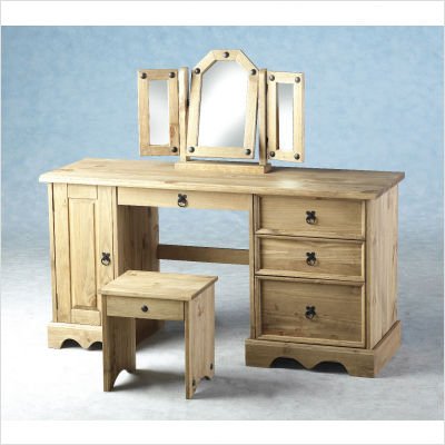 Corona Dressing Table Stool not included Order by 11am and receive next day Features: -Dressing table. -Brighton collection. -Distressed waxed pine finish. -Can be used as computer desk. -Mirror and Stool not included. -Narrow centre drawer has no sides. -Assembly required.
