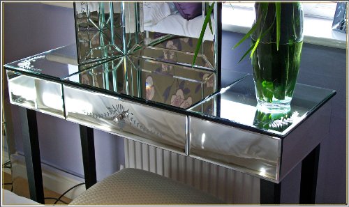 Pretty mirrored glass dressing table with etched floral detailing and a single pull out drawer. Matching mirror and stool also available.