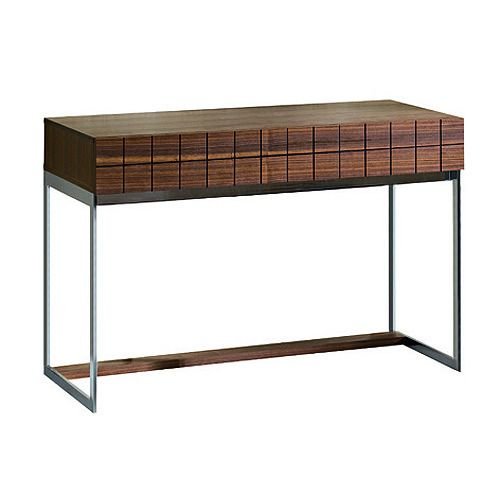 With a rich walnut veneer blackened groove highlights a chromed steel frame this dressing table has a contemporary feel that would look good in any room. This dressing table has two draws that give it an extra edge of versatility also working well as a hall or consol table.
