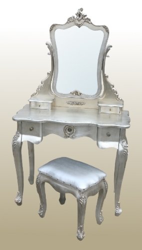 A beautiful french style dressing table set, complete with mirror and padded stool.Made from wood and painted a lovely silver.Overall height 157cmsheight to table top 78cms width 88cmsdepth 45cms