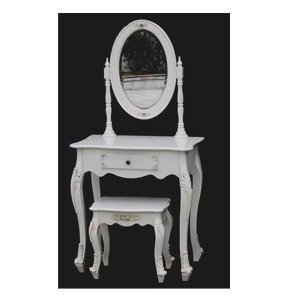 Gorgeous French style dressing table and stool set in antique white. A single drawer to the dressing table and swivel position mirror. Lovely carved detailing throughout and gently curved cabriolet legs. Matching stool supplied.