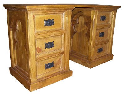 Gothic style dressing table with multi layered panels gives this pine furniture depth. Kiln fired black metal handles together with rich natural wax add the required finish.