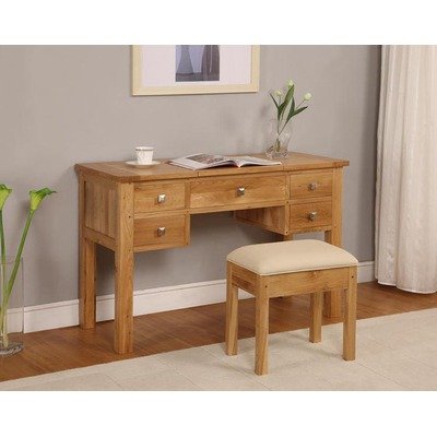 BHDRT1 Our Havana oak collection has been designed to compliment both traditional and contemporary homes. It is beautifully made in the traditionalmanner and the finish is a very soft sheen lacquer making it practical and functional. The clean lines and design details give our Havana oak furniture an incredibly distinctive look. The range can have either steel or forged, dark copper colour handles/knobs. A great feature of the Havana oak wardrobes is that they easily dismantle, enabling them to go up the smallest staircase. Features: -Four drawer dressing table. -Havana Blonde range. -Natural oak finish. -Solid oak construction. -Modern style. -Elegant dressing table. -Features centre section which lifts up to reveal a fantastic storage area and a mirror. -Assembly required.