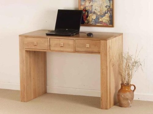 The Nero Solid Oak Computer Desk/Dressing Table utilises a minimalist design to provide everything required as efficiently as possible. There is plenty of space on top for your laptop, desktop or dressing table mirror to sit comfortably and three spacious drawers offer all the storage space necessary. As with all of our products the piece is made entirely from 100% solid hardwood with no cheaper alternatives or veneer ever used. The clean-cut lines and chunky handles make for a more contemporary design and will be perfectly suited either in the home office or as a dressing table in your bedroom.