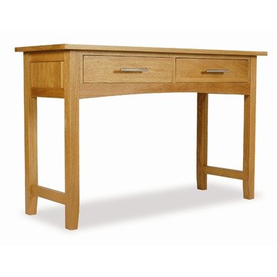 HOCON Features: -Console dressing table. -Material: Solid American Oak. -Linden Oak finish. -Dovetailed drawers. -Tongue and groove drawer bases. -Assembly required.