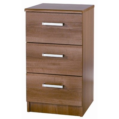 ALB3 Features: -Three drawer bedside table.-Visualise Range.-Material: MDF / MFC.-Metal runners.-Solid drawer base.-Designer handles.-Fully assembled. Color/Finish: -Finish: Natural Aida Walnut.